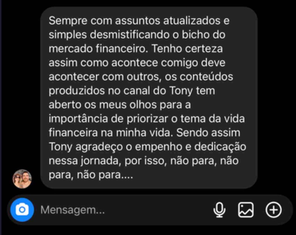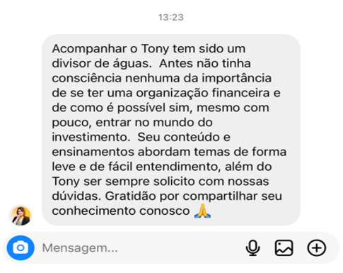 Você tem o direito por lei de testar o produto durante 7 dias. Se dentro desse período você achar que o método não é para você, basta nos enviar um e-mail para contato@tonyfinancas.com.br para solicitar todo o estorno do seu investimento.